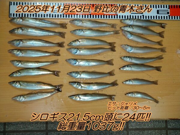 また、今日総重量1キロ越えの釣果があったようにシロギスもまだ行けそうです。エリアによって大きなムラが出る時期なので、同じポイントにこだわらず広く探る(距離も)のが鍵だと思います。