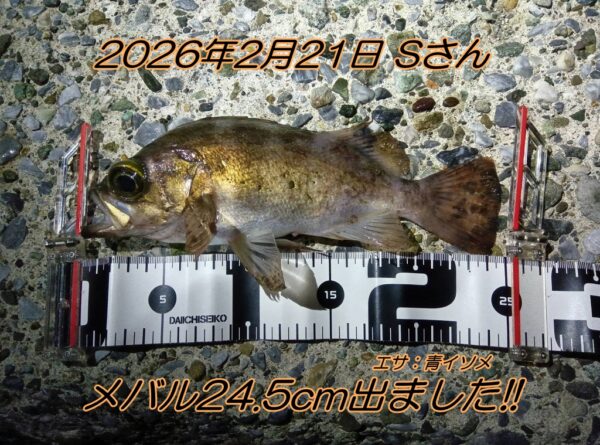 2月後半~3月にかけては暖かくて強い南西風が吹くことが度々ありますが、風が止んで荒れた海が穏やかになっていく過程でメジナやクロダイの好釣果が出ることが少なくないです。今回は現在吹いている南西風が落ち着く明日後半から明後日にかけてが狙いどころとなりそうですが、どうなりますか。とても気になるところです。