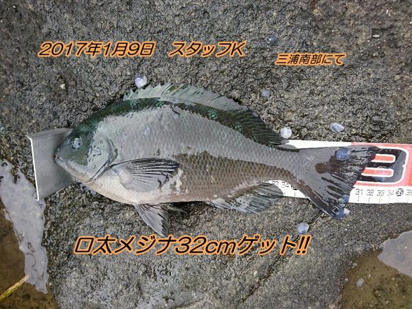 1/9(月)メジナ釣りに行って来ました。前回の初釣りはメジナのアタリを捉えられずに玉砕。今回は何とかしてメジナの顔を見たいところです。前日の天気予報によると波高3mでウネリあり。低水温でブルブル震えているメジナの活性が上がるには願ってもない好条件の予報でした。ところが現地に着いて海を見た途端、『うーん』。たまにうねりが入っては来るもののほぼ凪ぎに近い海。メジナの活性を上げるには程遠い状況です。厳しい戦いになるなと覚悟の上実釣を開始しました。