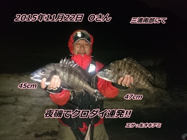 そして再開。先程よりさらにタイトに流すと37cmと31cm。日付も変わり『数投したらそろそろ止めましょう』と調子に乗って際々に仕掛けを入れていくと最後はお約束の根掛かりで高切れ。強制納竿となりました。一発はなかったですがここ1ヶ月パッとしない釣果が続いていたので夜磯を満喫できました。夜間の冷え込みもキツくなってきましたがまだまだ夜釣りを続けますよ~(^^)。