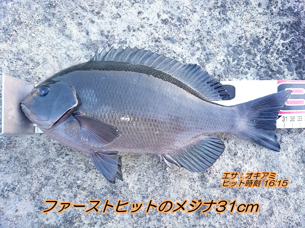 16:00、『よい子のみなさん』の防災無線音楽がいよいよ最終盤の追い込みを告げてくれました。『ここで一発ドカンとくる展開が最高なんだけどなぁ。頼む来てくれ~。』そう願いを込めていた16:15、待ちに待った31cmのメジナがガツンと食ってくれました!!このメジナがヒットした場所の水深は1ヒロ(約1.5m)位です。