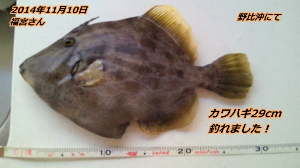 ■状況:『9:30頃から知人のボートに便乗し野比沖でカワハギを狙いました。北風、風波が強く大苦戦しましたが、11:00頃に29cmのカワハギを釣ることできました。エサはアサリのむき身です。』