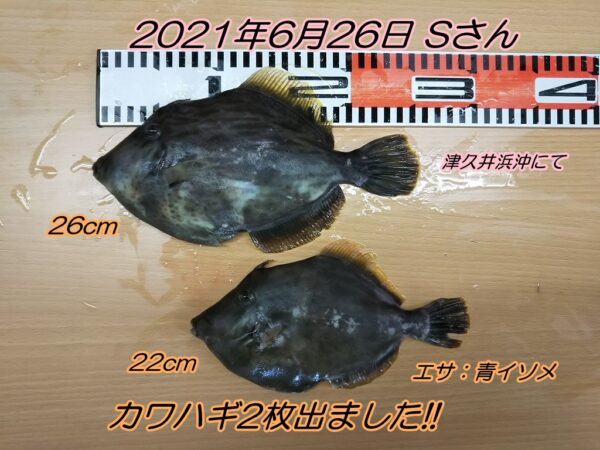ボートでマゴチ51cm940g&カワハギ2枚ゲット! 2021年6月26日 16:30 船・ボート釣り ■日付:6月26日 ■天気:晴れのち曇り ■潮回り:大潮 ■場所:津久井浜沖 ■お名前:Sさん ■釣果:マゴチ51cm940g、カワハギ26cm、22cm、ゴテンアナゴ、エソなど ■コメント:今日早朝、お店の眼前・津久井浜からマイボートで沖に出たSさん。水深10m前後のポイントでワームにヒットしたのは51cm940gの良型マゴチ!!さらには青イソメで26cmと22cmのカワハギも追釣。いずれも開始間もない早朝5時前に食ってきたそうです!(^^)!おめでとうございます!