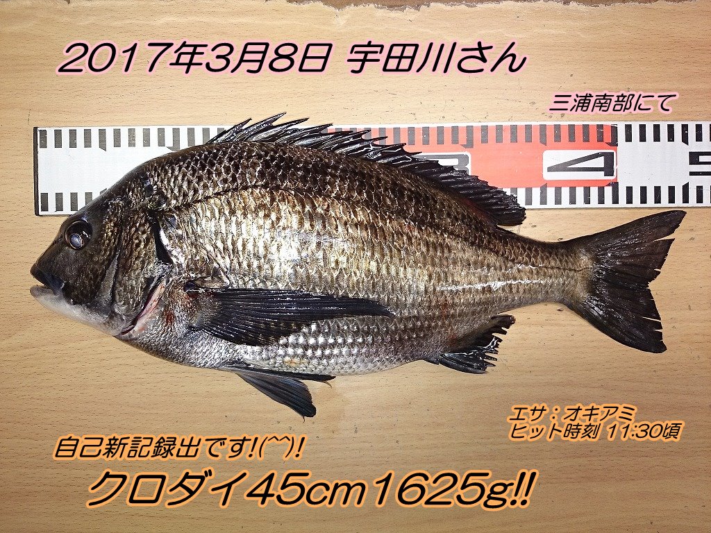 ■コメント:宇田川さんが自己新記録のクロダイをゲットしました!!とても綺麗な魚体で、乗っ込みをうかがわせる腹周りでした。保険で持って行ったボイルオキアミが、ここぞ一番の勝負所で効いたそうです。おめでとうございます!