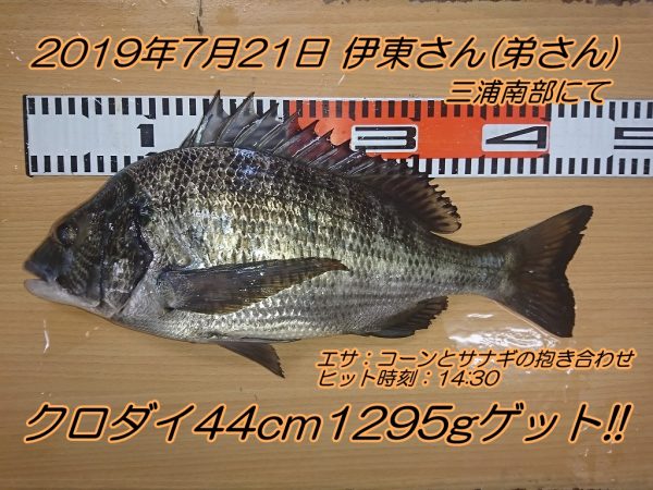 クロダイ44cm1295g出ました! 2019年7月21日 16:20 クロダイ釣り ■日付:7月21日 ■天気:曇り時々晴れ ■潮回り:中潮 ■場所:三浦南部 ■お名前:伊東さん(弟さん) ■釣果:クロダイ44cm1295g ■コメント:いつもご兄弟でクロダイ釣りを楽しむ伊東さん。今日は弟さんが44cm1295gのクロダイをゲットしました。銀ピカ、鰭ピンの理想的なモデル体型で写真映りも抜群のイケメンクロダイ。引きも強かったことが想像できます。ヒット時刻は14:30、エサはコーンとオキアミの抱き合わせです。おめでとうございます!