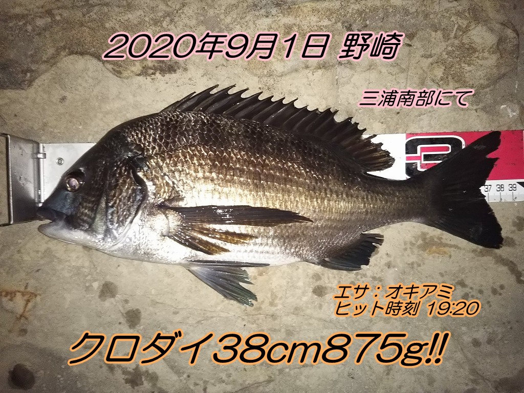 半夜釣りでクロダイ38cm875g! 2020年9月3日 15:41 クロダイ釣り ■日付:9月1日 ■天気:晴れ ■潮回り:大潮 ■場所:三浦南部 ■お名前:野崎 ■釣果:クロダイ38cm875g、口太メジナ24cm×1匹、クサフグ×9匹(全釣果) ■コメント:一昨日、半夜釣りに行ってきました!(^^)!開始から納竿までクサフグが多い中、2、3投だけオキアミが残ることが3回あり、そのうち1回のチャンスで38cm875gのクロダイがヒットしました! 痛めている右手親指はまだ完治していませんが、徐々にペースアップしたいと思います!!
