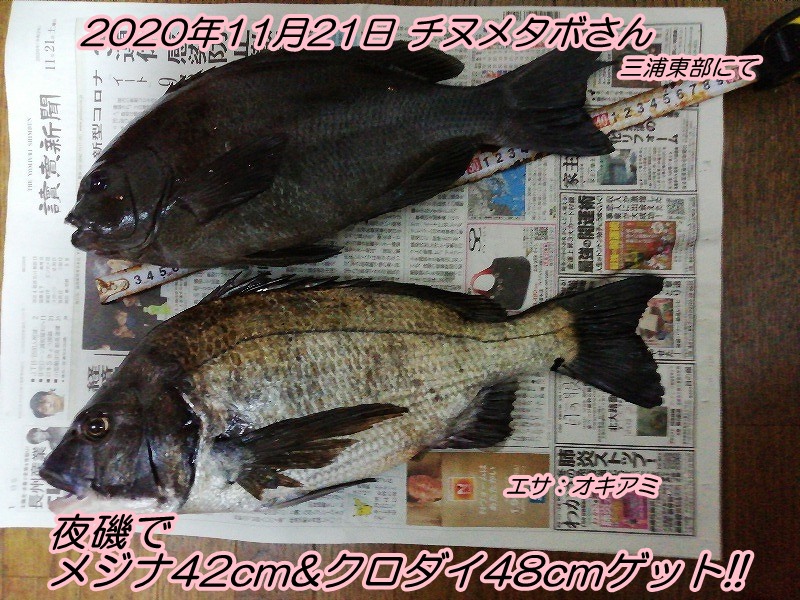 ■コメント:昨日半夜釣りに出掛けたチヌメタボさんから激アツメールが届きました!40cmオーバーのメジナが3匹に48cmのクロダイなど得意の浅場狙いが炸裂しました。チヌメタボさんのポイントもやっぱり素通りされがちな浅場です。場所取りとは無縁の超穴場で良型魚を釣る。夜釣りは色々な魅力が詰まっていて本当に面白いです。チヌメタボさん、良型魚連発、おめでとうございます!