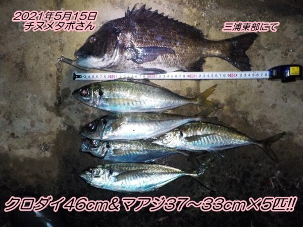 ■釣果:クロダイ46cm、マアジ5匹(37cm×2匹、35cm、34cm、33cm)