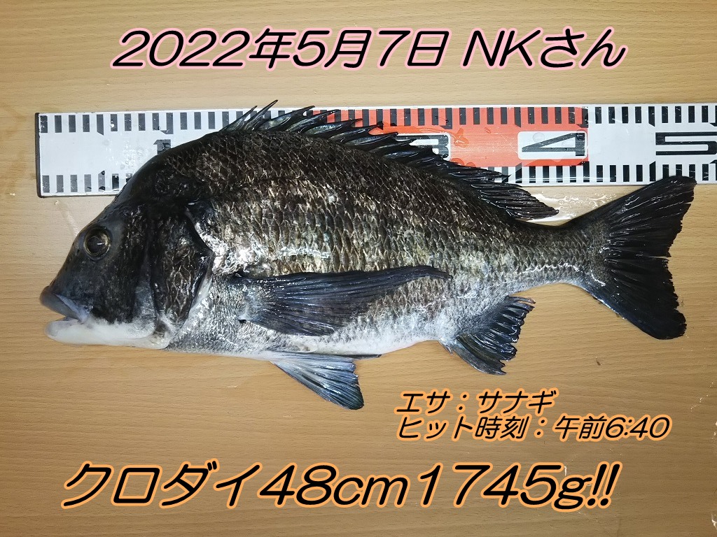 ■コメント:時折本降りの雨が降る中、早朝からクロダイ釣りに突撃したNKさんが48cm1745gの良型をゲットしました!!開始から20分位はオキアミで勝負できたそうですが、その後はクサフグが出てきてオキアミ瞬殺…。そこで得意のサナギ一本で攻め倒し、狙い通り本命のアタリをキャッチしました。