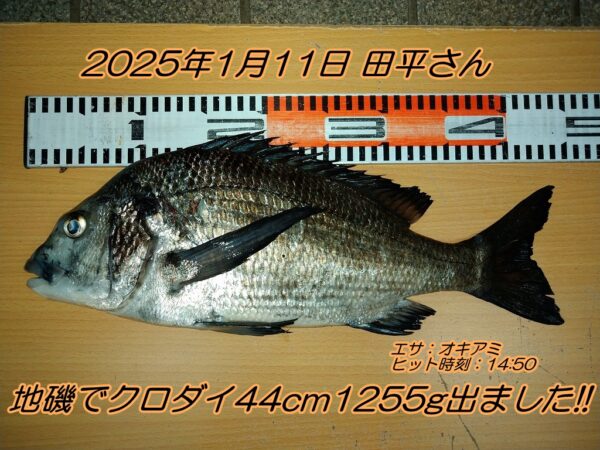 ■コメント:初釣りで地磯に出掛けた田平さんが44cm1255gのクロダイを仕留めました。釣り納めはアイゴに好かれてしまって釣った数はなんと30匹以上。うまく行きませんでしたが、2025年は鰭ピン銀ピカの磯クロダイでスタートダッシュを決めました。いきなりいい魚が来てくれて良かったですね。おめでとうございます!