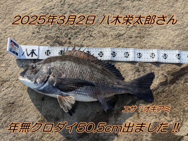 激しい食い渋りの中、ドカンと食ってきたのは何とびっくり50.5cmの年無クロダイ!!細い仕掛けでの緊迫したやり取りの末、無事に手にした貴重な大物に歴戦の猛者・八木さんも大喜び!(^^)!
