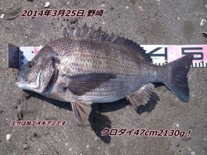 渚釣りでクロダイ4枚出ました! 2014年3月26日 10:44 クロダイ釣り ■日付:3月25日 ■天気:晴れ ■潮回り:長潮 ■場所:三浦半島東側 ■お名前:野崎 ■釣果:クロダイ47cm2130g、46cm1880g、44cm1610g、41cm1300g(全釣果) ■コメント:マルキュースタッフさんや友人・知人たちと渚釣りに行ってきました!アタリは6回あり、内訳はクロダイ×4枚、クロダイ針外れバラシ×1回、コーンで針に乗らず×1回でした。クロダイ以外は掛かりませんでした。後ほど釣行記を書きます。