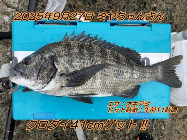 ■状況:『午前8時から紀州釣りでクロダイを狙いました。波があり寝ウキのアタリがわかりにくいので、フカセ釣りに切り替えた途端に11時頃41cmのクロダイがあがりました。紀州ダンゴがコマセとして効いていたと思います。エサはオキアミです。』