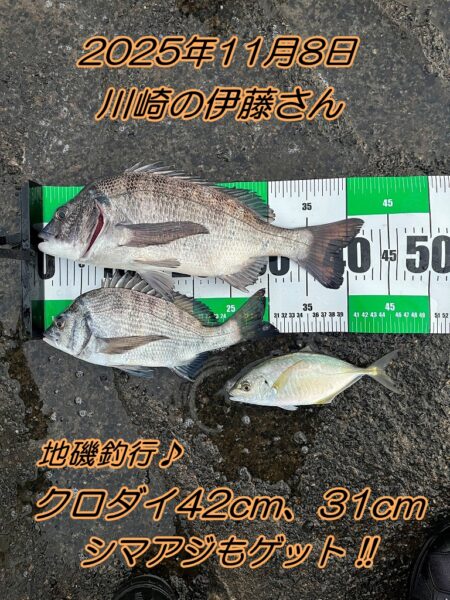 エサ取りにやや手を焼きつつ、潮流の変化を見逃さず42cm、31cmのクロダイ複数釣果は流石です。秘かに狙っていたシマアジも小ぶりながら1匹ゲット!おめでとうございます!