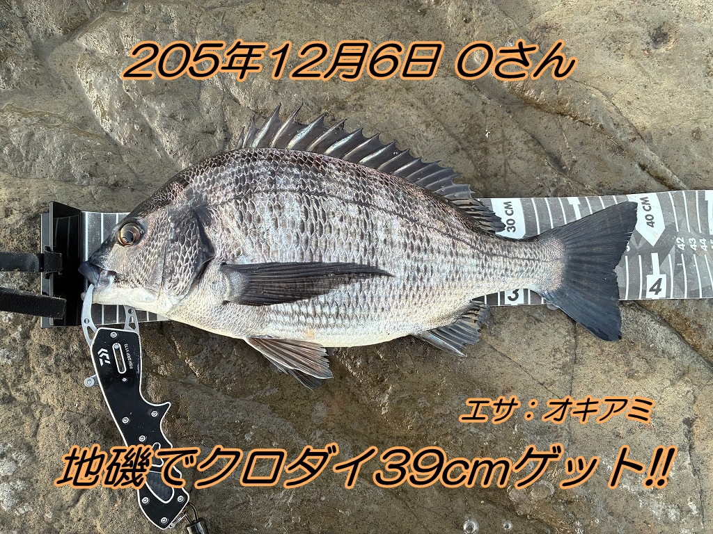 ■コメント:昨日地磯に出掛けたOさんからメールが届きました。釣りづらい状況で苦労しつつも1チャンスを生かしてクロダイのヒットに結び付けました。自分の思い描く状況にはならないのが自然相手の釣り。その苦労や試行錯誤を繰り返すことが次の1匹に必ず繋がることでしょう。今回のクロダイは貴重な価値ある1匹。おめでとうございます!