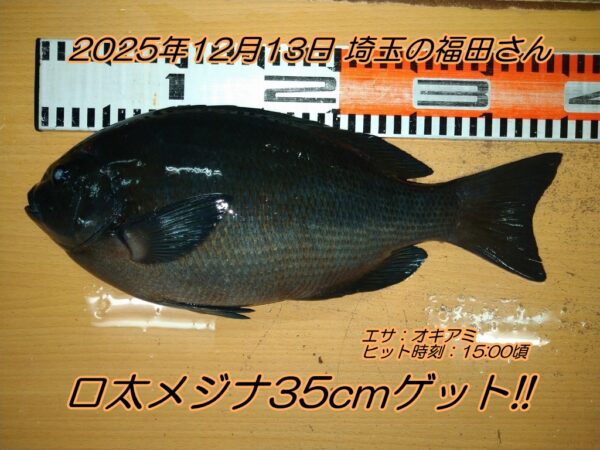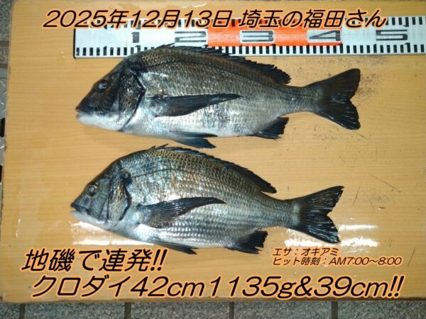 ■コメント:早朝から地磯に出掛けた福田さんがクロダイ42cm&39cmと口太メジナ35cmをゲットしました。浅いタナのエサ取りはほぼおらず、仕掛けを入れ込むとたまにベラが掛かる期待を持てる状況。クロダイは7時台に連続でヒットし、15時頃にメジナが来てくれたそうです。