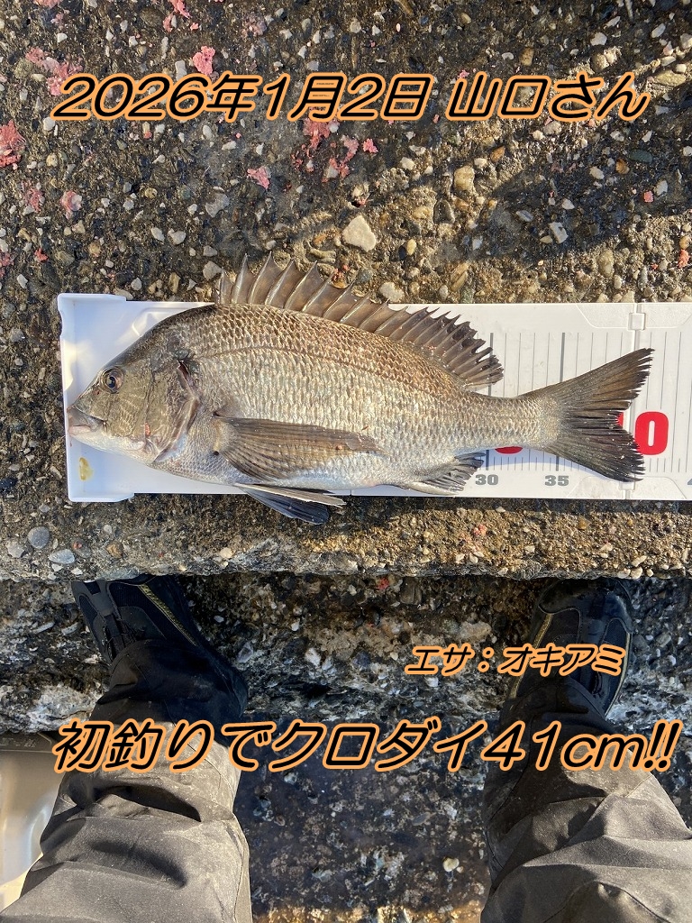 ■コメント:初釣りで3人でアシカ島に出掛けたギダさんご一行が4匹のクロダイをゲットしました。前回(年末)に続き今日もエサ取りはおらずオキアミは残りっぱなし。クロダイやメジナの本命魚も食い渋る状況でしたが、数少ないアタリを捉えてクロダイ全員安打を達成しました。2026年の初釣り。3人仲良くクロダイの顔を見ることができたのが何よりですね。今年も釣りまくってくれることを期待しています!