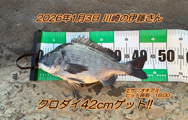 ■状況:『13:00頃から開始しました。しばらくは餌が残り、たまにフグや小さなタカノハダイが釣れる状況でしたが、まず16:00に42cmのクロダイが釣れました。