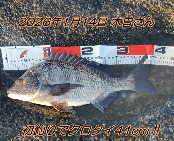 ■コメント:三浦地磯に詳しい木曽さんにご投稿いただきました♪1/14は快晴&北寄りの弱風という絶好の磯釣り日和となりました。前日の西南西強風の余波が残る中、お昼からの初釣りでクロダイ41cmをゲット(*^-^*) 浅場のサラシ場攻略が決まりましたね!!おめでとうございます!