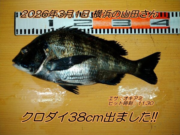 ■コメント:アシカ島に渡船した山田さんが奇麗な磯真鯛50cmと乗っ込み腹パンのクロダイ38cmをゲットしました。今日も相変わらずの激渋状況でしたが、数少ないアタリをしっかりモノにしました。真鯛は40mほど沖で食わせたそうですが、潮に乗せたのではなく遠投してのヒット。潮の動きが緩慢と判断して沖を攻めたのが功を奏しました。判断、食わせの技術、そして大物が来ても動じないやり取り、本当にいつもさすがです。おめでとうございます!