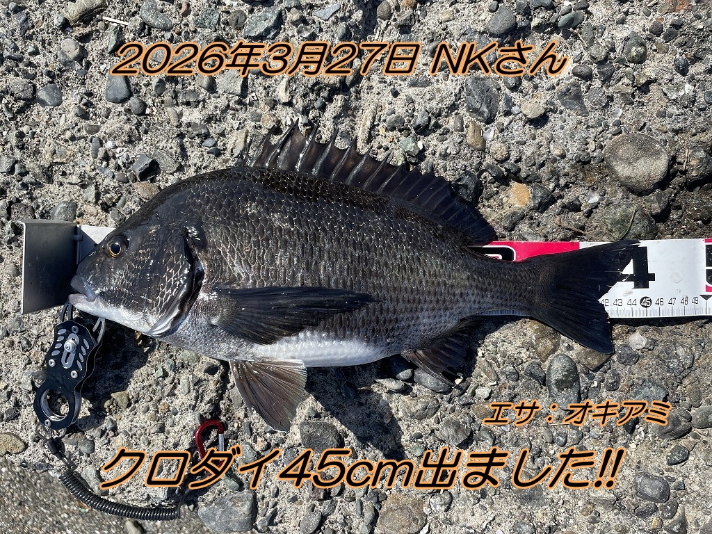 ■コメント:先週クロダイ9匹の爆釣劇を演じたNKさんが今週(昨日)は6匹のクロダイをゲットしました。時合に畳みかけた前回とは違って今回は時合らしい時合はなくポツポツと拾い釣り。こういう堅実な釣りができるのもNKさんの凄いところです。中盤にクロダイの気配を感じてからのオキアミの選択、お見事でした。乗っ込みクロダイ、もっともっと楽しめそうですね。おめでとうございます!