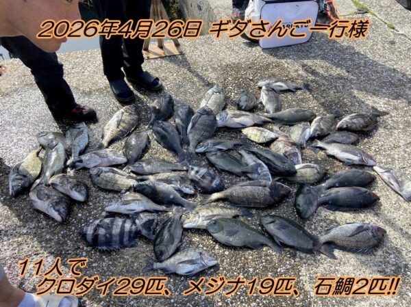 ■釣果:クロダイ29匹(最大49cm)、メジナ19匹(最大39cm)、石鯛2匹(11人合計)