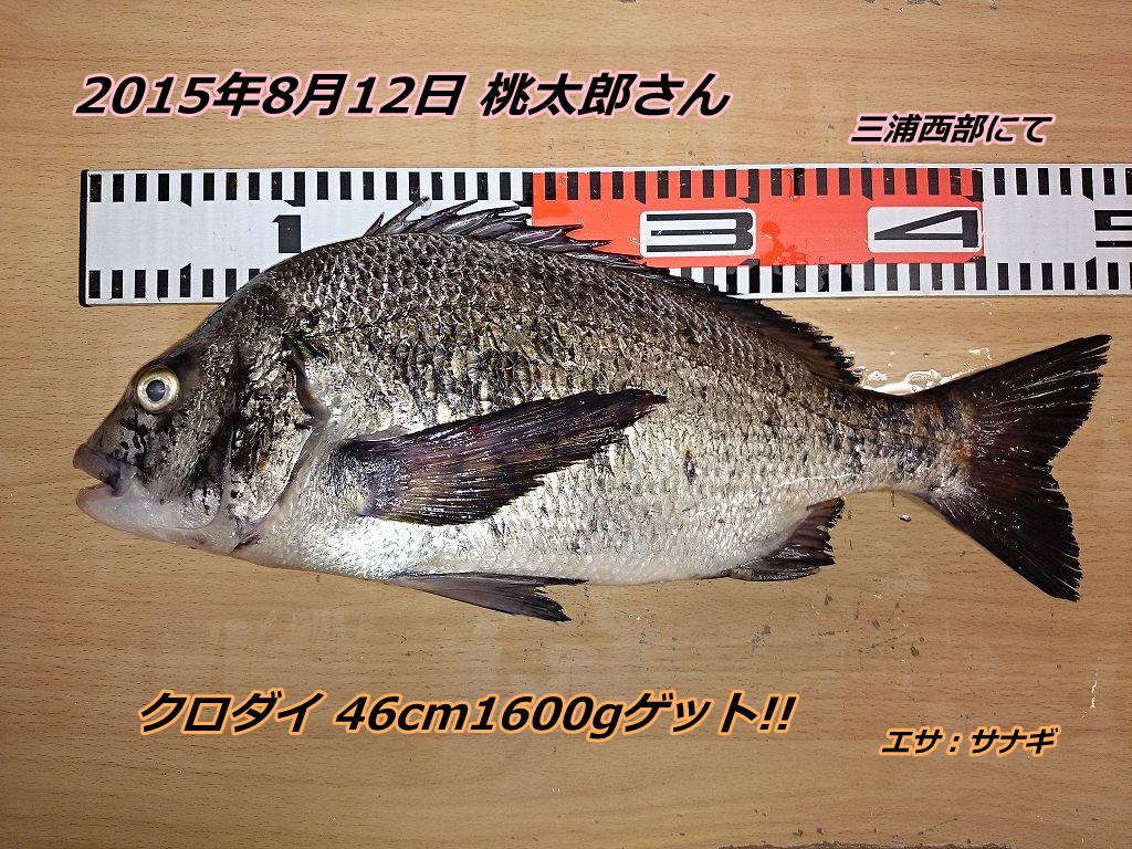 クロダイ46cm1600gゲット! 2015年8月12日 19:28 クロダイ釣り ■日付:8月12日 ■天気:晴れ ■潮回り:中潮 ■場所:三浦西部 ■お名前:桃太郎さん ■釣果:クロダイ46cm1600g、カイズ■状況:『オキアミだとエサ取りを交わせず、サナギ2粒掛けにしたら食ってきました!棒ウキが斜めに消し込んだので、群れているボラのスレ掛かりかと思ったら本命でした!(^^)! 午後の上げはカイズ1枚でした。 』■コメント:クロダイ師・桃太郎さんが46cm1600gの良型クロダイをサナギで釣り上げました!ヒット時刻は正午頃です。おめでとうございます!