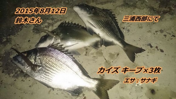 ■コメント:夕方からカイズ狙いで出かけた鈴木さんが本命を乱れ打ちです。写真はキープした3枚です。前回のカイズと良型尾長メジナのWゲットに続き今回もカイズの数釣りと毎回さすがですね。おめでとうございます!