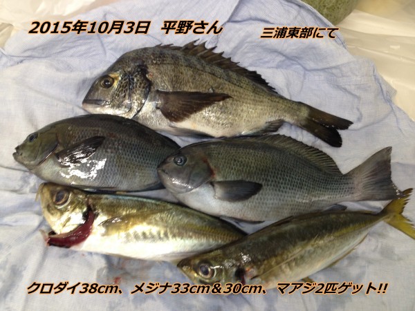クロダイ38cm釣れました! 2015年10月4日 18:28 クロダイ釣り ■日付:10月3日 ■天気:晴れ ■潮回り:中潮 ■場所:三浦東部 ■お名前:大和の平野さん ■釣果:クロダイ38cm、口太メジナ33cm&30cm、マアジ2匹 ■コメント:釣行前にお店に立ち寄った平野さん。私スタッフKとお互いの釣りの近況を報告しあってから夜磯に出かけていきました。うねりがあってやりづらかった状況の中見事にクロダイとメジナWゲットです。型のいいマアジも美味しそうですね。おめでとうございます!