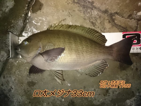 ■釣果:口太メジナ40cm1055g、33cm、33cm(メジナ合計5匹)、カサゴ25cm、ムラソイ22cm、メバル×2匹、ウミタナゴ×2匹(全釣果)