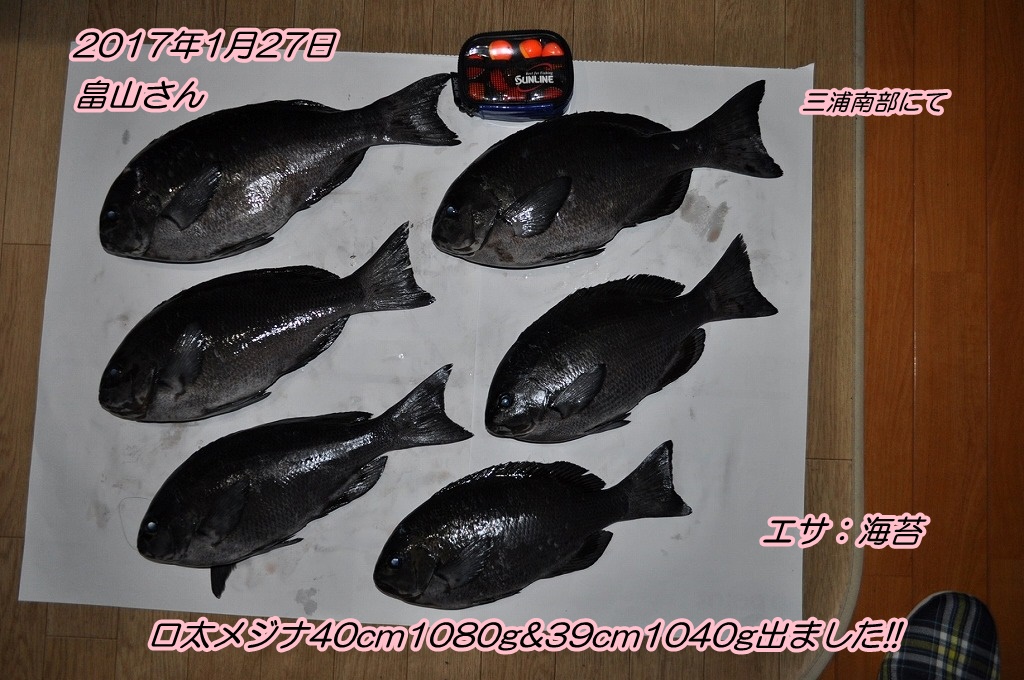 ■コメント:海苔メジナの鉄人畠山さんからメールで釣果報告をいただきました。1kgを超える良型2枚を含めどの魚も乗っ込み控えてお腹がパンパン。重量感たっぷりで釣り味満点だったことでしょうね。強い風が吹いて釣り辛いコンデイション中さすがです。おめでとうございます!