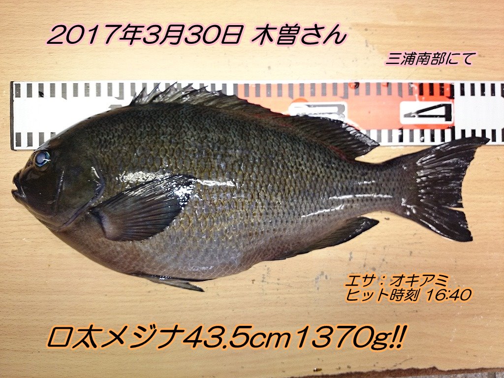 ■コメント:南部エリアの磯釣りにとても詳しい名手・木曽さん。今回は食い渋りに遭遇しつつ、風や波を避けられるポイントに移動し、43.5cm1370gの乗っ込みメジナを手にされました。いつもニコニコ笑顔の木曽さんですが、今日はひときわ笑顔がはじけてました^^おめでとうございます!パンパンのお腹からは白子が流れ出ていました。