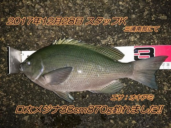 ■コメント:昨日は午後からメジナを狙いました。海水温14℃台で激渋予想でしたが日中のメジナの活性は高く1投目からアタリがありました。15:30分頃からは獲れた魚は3匹(最大34cm)でしたが6投連続でメジナがヒット。道糸がピューっと走る気持ちのいい当たり方が多かったです。夜は一転して渋々。最後に仕掛けが落ち着く足下で38cm870gが釣れてくれました。この秋は数は釣れるものの35cmの壁が破れずにいましたが、年内に38cmが釣れていい釣り納めができました。
