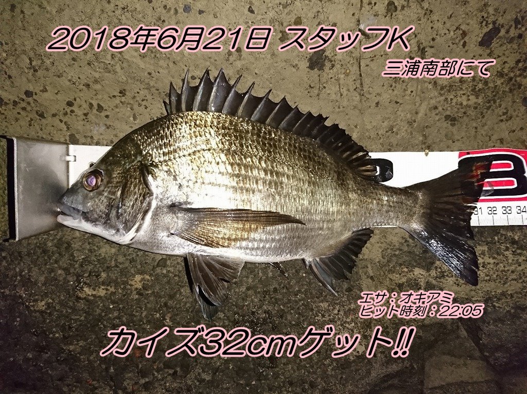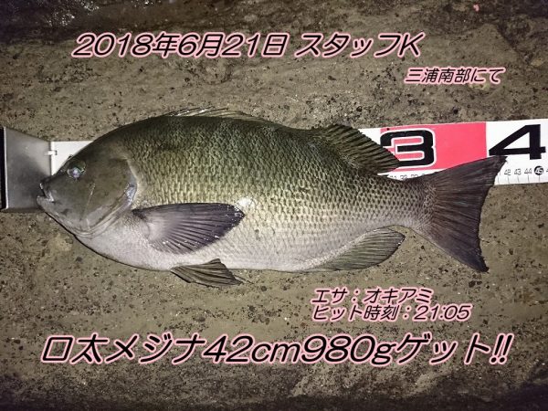 ■コメント:昨日午後から竿を出してきました。フグが高活性で明るい時間は不発。暗くなってかしばらく経った21:00過ぎに口太メジナ42cm、22:00過ぎてからカイズ32cm、その後にクロダイ37cmが食ってきました。梅雨前線と南西風の影響でうねりが強く仕掛けを思い通りにコントロールすることに難儀しましたが、根際キッチリに付けエサを入れることができるとアタリが出ました。昨日は雨の影響で水潮気味で潮色が今一つでしたが、回復してくると面白そうですね!