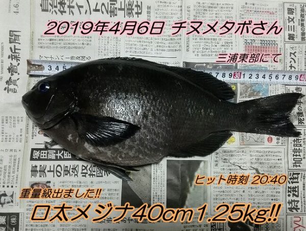 重量級メジナ40cm1.25kg出ました! 2019年4月7日 12:24 メジナ釣り ■日付:4月6日 ■天気:晴れ ■潮回り:大潮 ■場所:三浦東部 ■お名前:チヌメタボさん ■釣果:口太メジナ40cm1.25kg ■コメント:良さそうな釣り場を求めて三浦東部→西部→東部と移動を繰り返したチヌメタボさん。その執念が実って、4か所目の超浅場で腹パン重量級のメジナを仕留めました!!お送りいただいたメールには、あきめない強い気持ち・前向きな気持ちが表れていました。良型ゲットおめでとうございます!