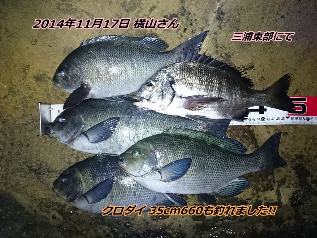 ■釣果:口太メジナ39cm855g、37cm、33cm、クロダイ35cm660g(横山さん)、口太メジナ36cm、33cm(野崎)
