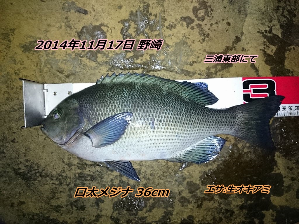 ■コメント:横山さんと野崎で三浦東部の地磯に出撃しました。14:00頃35cm660gのクロダイが横山さんにヒット!日が落ちてからは南西強風を避けられる場所に移動。タフコンディションの中、横山さんは39cm、37cmの良型口太メジナを仕留めました。おめでとうございます!あまり良いところが無かった私にも、納竿間際になって36cmの口太が食ってくれました(^o^)エサは全て生オキアミです。