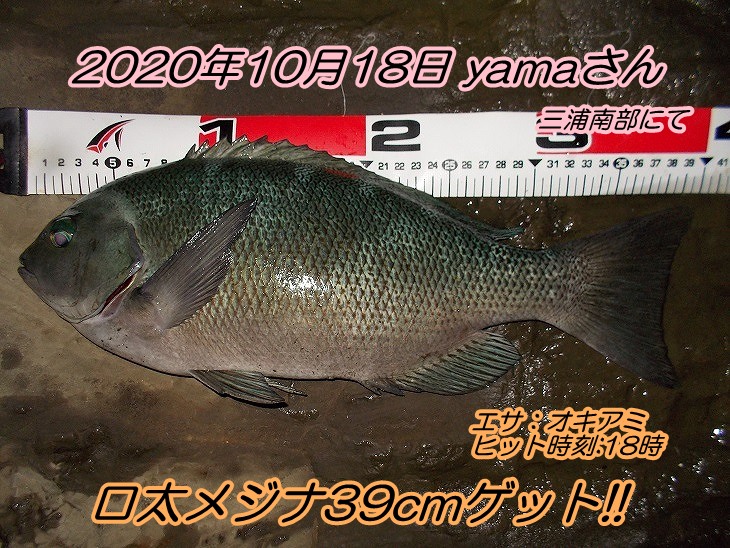 ■状況:『今回はまだ竿出したことのないポイントを選択しました。適度にウネリもありサラシの中を攻めて16時頃に30cm。18時に39cmがヒットしました!!その直後に40cmのフッコを上げて終了。久々メジナの引きを堪能しました。エサはオキアミです。』