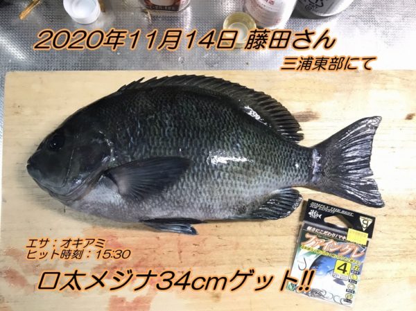 ■コメント:今週は半夜のメジナ狙いに出掛けた藤田さんが39cmと34cmの口太メジナをゲットしました。この秋は、磯ブッ込みで良型カワハギ連発、サーフでシロギス連発、そして今回の良型メジナとターゲットを問わず絶好調ですね。1.25号のハリスで39cm、お見事でした。おめでとうございます!