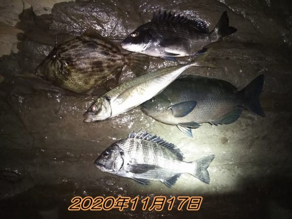 ■コメント:最近は三浦東部への釣行が続いていたので、昨日11/17(火)は南部地磯に行ってきました。実釣時間は12:50~19:55。開始早々、肝パン肉厚のでっかいカワハギが釣れて最高のスタートダッシュに成功!!その後はフグの猛襲を受ける時間帯を経て、日没前にエサ取りが消えて最高の展開へ。唯一のメジナは丸々肥えて37cmで965gもありました。本命の一角、大アジは40cm505gを筆頭に大型が散発的に3匹ヒットしました!!大きなカワハギやアジが釣れて大満足の釣行でした(*^^*)ウキ下は2.3m~3.3mです。