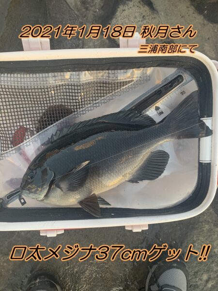 ■コメント:一昨日出掛けた秋月さんが30cm台後半のメジナを4連発しました。うねりがあってラインメンデイングや付けエサとコマセとの同調が少し難しい状況でしたが、上手くコントロールして良型連打に繋げました。先月の磯真鯛の続いての好釣果。さすがですね。おめでとうございます!