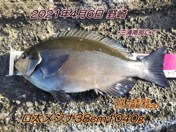 ■釣果:口太メジナ40cm1265g、39cm1055g、38cm1040g(メジナ合計43匹。内訳:40cm~35cm×5匹、35cm~30cm×9匹、30cm未満×29匹)、アナハゼ×1匹(全釣果)