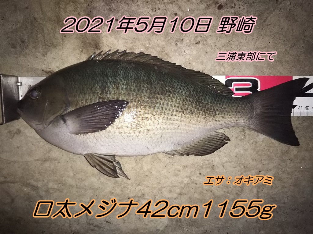 検量&写真撮影後の再開直後、強烈な引きでこの日2枚目の口太42cm1155gが食ってきました!!そして最後に33cmのマアジがヒットして納竿しました。
