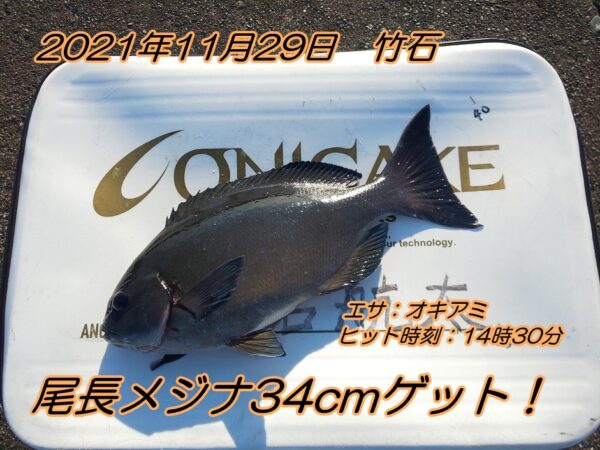 ご飯を食べたり仮眠をしたりしながら少し時間を空けて釣り再開、小アイゴの活性は相変わらず下がらず厳しい状況でしたが、少しずつメジナの活性が上がり水面下50cmぐらいのタナまで浮いているのが確認できてひと安心。13時頃からコンスタントに釣れ始めて、最後はこの日最大の34cmがヒット、その後納竿となりました。