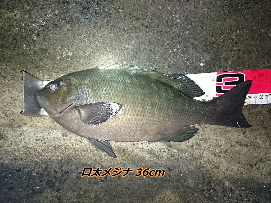 ■釣果:口太メジナ38cm860g、36cm、35cm、34cm(メジナ合計13匹)、マアジ32cm×1匹、メバル×3匹、ウミタナゴ×5匹、クサフグ×16匹、ドンコ×1匹、アイゴ35cm×1匹(全釣果)