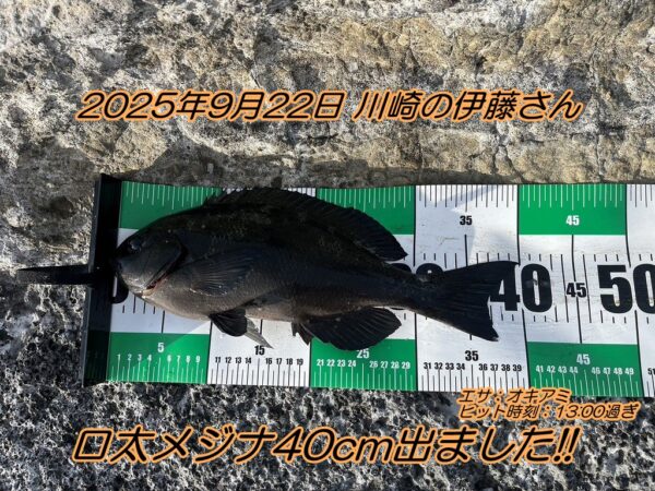 ■コメント:9/22(月)に磯に出掛けた伊藤さんからご報告が届きました。開始早々に口太の40cmをゲット。2週間前に42cmの尾長メジナ釣り上げている伊藤さん。9月だけで尾長、口太ともに40cmオーバーを達成したのは本当に凄いです。涼しくなりましたが、デカ判尾長チャンスは引き続き継続中。2度のバラシのリベンジ、期待しています。40cmオーバーの口太、おめでとうございます!