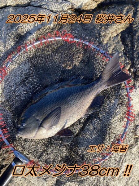 しかしそこは百戦錬磨の磯師・桜井さん。逆境にめげることなくあの手この手を駆使し、エサ取りに最も強い海苔エサで一点突破作戦を敢行!!そして粘り腰で釣り上げたのは38cmの良型口太メジナ2枚!(^^)!おめでとうございます!