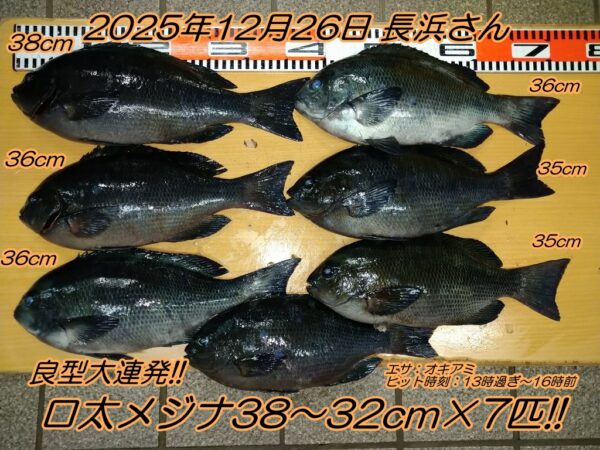 7匹中35cm以上が6匹!他にハリス切れが2回。実釣3時間でこの釣果は本当に素晴らしいです。アイゴも鳴りをひそめていたようで冬の口太メジナ、いよいよ開幕ですね。長浜さん、おめでとうございます!
