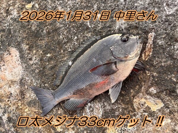 ■コメント:寒メジナ釣りに出掛けた中里さんにご報告いただきました♪当日は他魚のアタリも含め、魚からのコンタクトはかなりあった模様。その中から本命寒メジナのアタリを拾い、確実にフッキングに持ち込むというテクニカルな展開だったようですが、夕マヅメに口太33cmが釣れて良かったです!(^^)! おめでとうございます!
