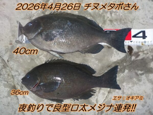 ■コメント:昨夜~今朝まで夜釣りに出掛けたチヌメタボさんからメールが届きました。今回はやや大きめの月が出る長潮。夜とはいえ魚の警戒心が高めの状況でしたが、魚にスキが出やすい暗部を狙い撃ちしてメジナを連発しました。まさに引きずりだした言える2匹の良型。さすがですね。